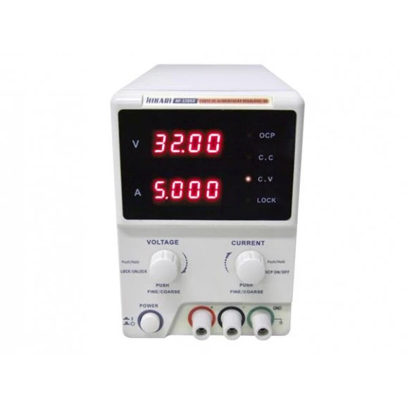 Modelo: HF-3205SCód. UCB: 21N156Equipamento digital de bancada, com dois displays de 4 dígitos (tensão e corrente), capaz de fornecer uma saída variável com tensão de 0 a 32V DC e corrente de 0 a 5A DC. Possui ajuste de tensão e corrente ajustado por potenciômetro, além de proteção contra sobrecarga, curto circuito, super aquecimento e inversão de polaridade.Alta estabilidade e Baixo ripple.Display 4 dígitos de fácil leitura para apresentação simultânea da tensão e corrente de saída.Saída Variável: 0 ~ 32V, 0 ~ 5A.Ajuste de Tensão e Corrente através de potenciômetros de precisão.Ajustes Grosso e Fino de tensão e corrente.Indicadores (LED) de Operação.Resfriamento com ventilação forçada.Circuito de proteção de sobrecarga.Altitude: 2000m (máx.).Grau de Poluição: 2.Uso Interno.Ambiente de Operação: 0°C~40°C, RH <80 porcento..Ambiente de Armazenamento: -10°C ~ 70°C, RH <80 porcento.Alimentação Selecionável: 110V/220V ± 10% -50/60Hz.Consumo Aprox.: 200W (máx.).Dimensões: 156(A) x 110(L) x 260(P)mm.Peso Aprox.: 4.8kg.OPERAÇÃO TENSÃO CONSTANTESaída: 0 ~ 32V.Regulação de Linha: <= (0.01 porcento +3mV).Regulação de Carga: <= (0.01 porcento +2mV).Ripple e Ruído: <= 1mV RMS.OPERAÇÃO CORRENTE CONSTANTESaída: 0 ~ 5A.Regulação de Linha: 0 ~ 5A <= (1 porcento +3mA).Regulação de Carga: <= (0.1 porcento +10mA).Ripple e Ruído: <= 3mA RMS.MOSTRADORDigítal de 4 dígitos duplo.Precisão: <= ± (1.0 porcento Leit. + 2 Díg).Resolução de Tensão: 0.1V.Resolução de Corrente: 0.01A.Fonte de Alimentação Bivolt HF-3205S - Hikari